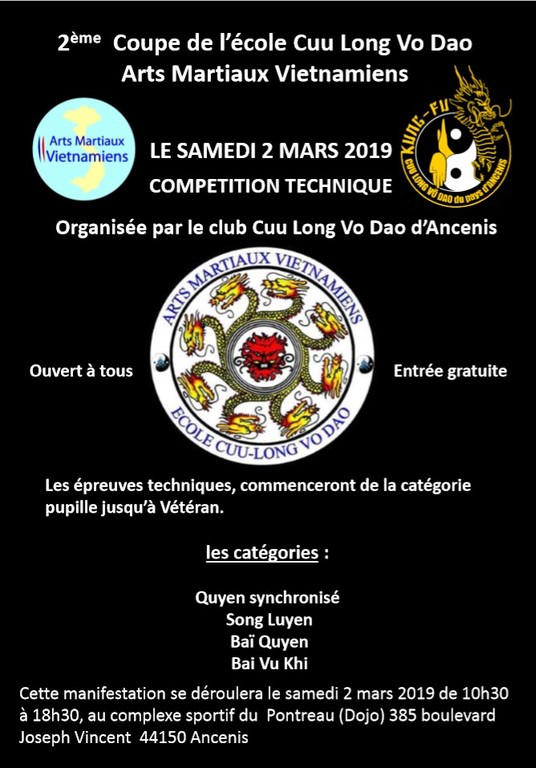 Voici la présentation du déroulement de la 2ème Coupe de l'école Cuu Long Vo Dao (Arts Martiaux Sino Vietnamiens) du samedi 2 mars 2019 à Ancenis
