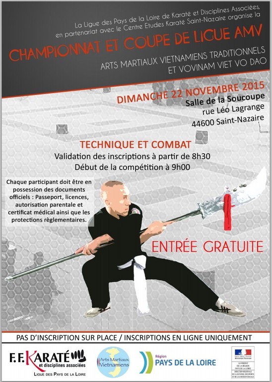 La ligue de Karaté et disciplines associées des Pays de Loire organise le Dimanche 22 Novembre une compétition d’Arts Martiaux Vietnamiens Traditionnels et Vovinam Viet Vo Dao (Technique et Combat).