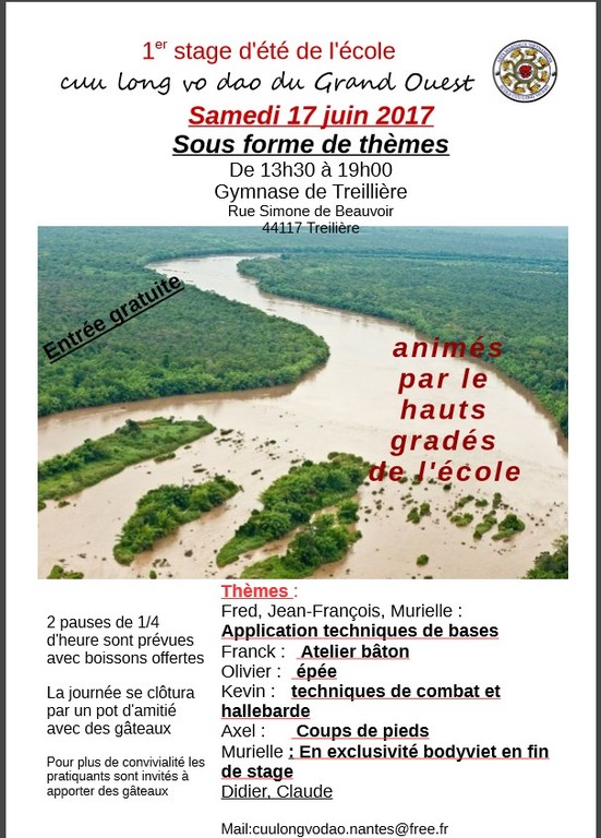 Grand stage d'été de l'école Cuu Long Vo dao qui aura lieu le 17 juin, de 13 h 30 à 19 h, au gymnase de Treillières. Il se déroulera sous forme de thèmes, animés par les ceintures rouges et jaunes responsables technique de l'école Cuu Long.