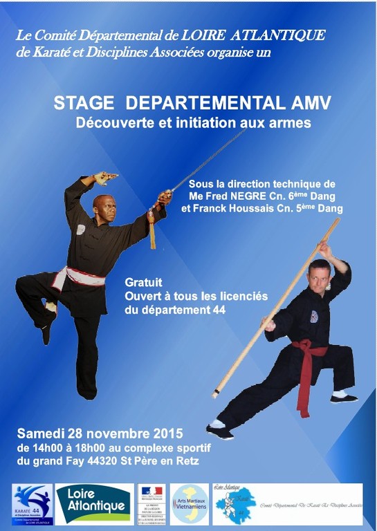 Le Comité Départemental de LOIRE ATLANTIQUE de Karaté et Disciplines Associées organise un stage départemental d’Arts Martiaux Vietnamiens le samedi 28 novembre 2015 de 14h00 à 18h00 au complexe sportif du grand Fay à St Père en Retz.